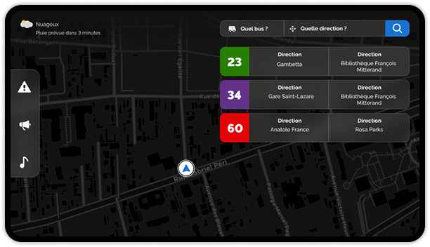 Nous avons réfléchi à une interface tactile intuitive, pouvant être utilisée rapidement et sans quitter la route yeux. Les fonctions sont accessibles et visibles du coin de l’œil grâce à des couleurs vives et des icons reconnaissables.